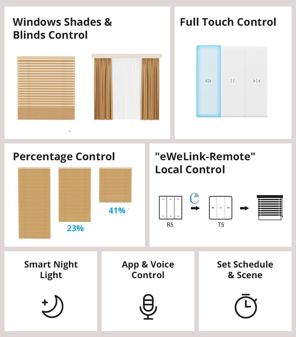 تحكم كامل باللمس: بالمقارنة مع مفاتيح اللمس العادية، يتميز T5-3C بمساحة لمس أكبر بكثير، مما يجعل التحكم في ستائرك بلمسة إصبع واحدة أمراً في غاية السهولة.